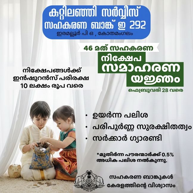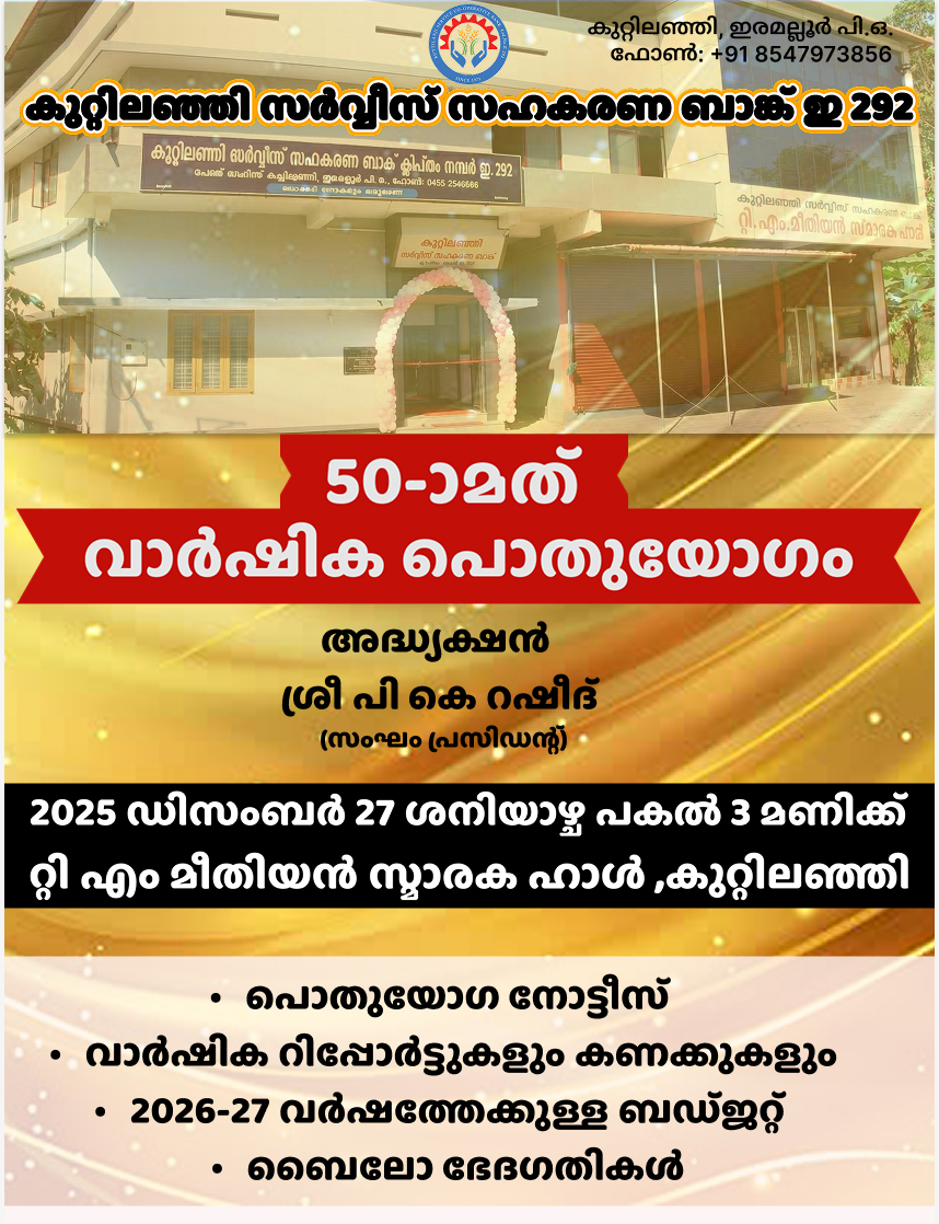 à´•àµà´±àµà´±à´¿à´²à´žàµà´žà´¿ സർവീസൠസഹകരണ ബാങàµà´•à´¿à´¨àµà´±àµ† à´†à´à´¿à´®àµà´–àµà´¯à´¤àµà´¤à´¿àµ½ സഹകാരി സംഗമം നടതàµà´¤àµà´¨àµà´¨àµ.ഡിസംബർ 21 -)൦ തീയതി à´¬àµà´§à´¨à´¾à´´àµà´š 4 മണികàµà´•ൠബാങàµà´•à´¿à´¨àµà´±àµ† à´±àµà´±à´¿.à´Žà´‚ മീതിയൻ à´¸àµà´®à´¾à´°à´• ഹാളിൽ വചàµà´šàµ നടകàµà´•àµà´¨àµà´¨ സംഗമം കോതമംഗലം à´Žà´‚ എൽ à´Ž à´¶àµà´°àµ€ ആൻറണി ജോൺ ഉദàµâ€Œà´˜à´¾à´Ÿà´¨à´‚ ചെയàµà´¯àµà´¨àµà´¨àµ. ബാങàµà´•ൠപàµà´°à´¸à´¿à´¡àµ»à´±àµ à´¶àµà´°àµ€ à´±àµà´±à´¿ à´Žà´‚ à´…à´¬àµà´¦àµàµ¾ അസീസൠഅധàµà´¯à´•àµà´·à´¤ വഹികàµà´•àµà´‚. "സഹകരണ നികàµà´·àµ‡à´ªà´‚" à´Žà´¨àµà´¨ വിഷയതàµà´¤àµ† സംബനàµà´§à´¿à´šàµà´šàµ à´¶àµà´°àµ€ കെ വി രാധാകൃഷàµà´£àµ» à´•àµà´²à´¾à´¸àµ നയികàµà´•àµà´‚.ഡിസംബർ 10 à´®àµà´¤àµ½ ജനàµà´µà´°à´¿ 10 വരെ നികàµà´·àµ‡à´ªà´¸à´®à´¾à´¹à´°à´£ മാസമായി ആചരികàµà´•àµà´‚. നികàµà´·àµ‡à´ª സമാഹരണവàµà´‚ à´•àµà´Ÿà´¿à´¶àµà´¶à´¿à´• നിവാരണവàµà´‚ വിജയിപàµà´ªà´¿à´•àµà´•àµà´µà´¾àµ» à´®àµà´´àµà´µàµ» ബാങàµà´•ൠഅംഗങàµà´™à´³àµ‹à´Ÿàµà´‚ à´…à´àµà´¯àµ¼à´¤àµà´¥à´¿à´•àµà´•àµà´¨àµà´¨àµ. Read More